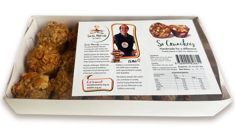 The SoCrunchee you know and love but rounder! Hmm, crunchy, chewy, sweet and savoury all in one bite - Anzac cookies with a fun twist! (Individual, Gift Box packages of 5 or 15) Ingredients: Butter, sugar, honey, brown sugar, salt, wheat flour, oats, bi-carb soda, almonds, coconut, cinnamon, nutmeg....