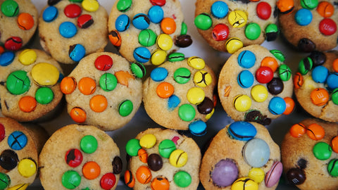 Bites exploding with M&M rainbow hues and chocolate chips. Smartly delightful and playful. Tickles the inner child in everyone.