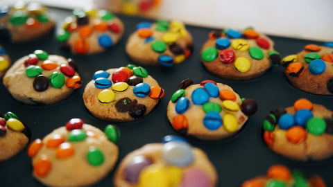 SoSmartees Bites Bites exploding with M&M rainbow hues and chocolate chips. Smartly delightful and playful. Tickles the inner child in everyone. (Individual or Gift Box packages of 5 or 15) Ingredients: Butter, sugar, brown sugar, salt, wheat flour, vanilla extract, baking soda, cornstarch, egg, dark chocolate chips, M&M's confectionary....