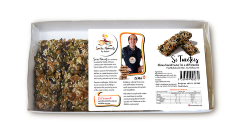 SoTweetees bars So scrumptious, crunchy generous bars crafted with gluten-free ingredients. Seedy, choc and fruit filled. (Individual or Gift Box of 6 bars) Ingredients: Egg white, brown sugar, sesame seeds, pumpkin seeds, sunflower seeds, dark chocolate chips, white chocolate chips, dried cranberries. Contains: egg, sesame seeds. Made in a...